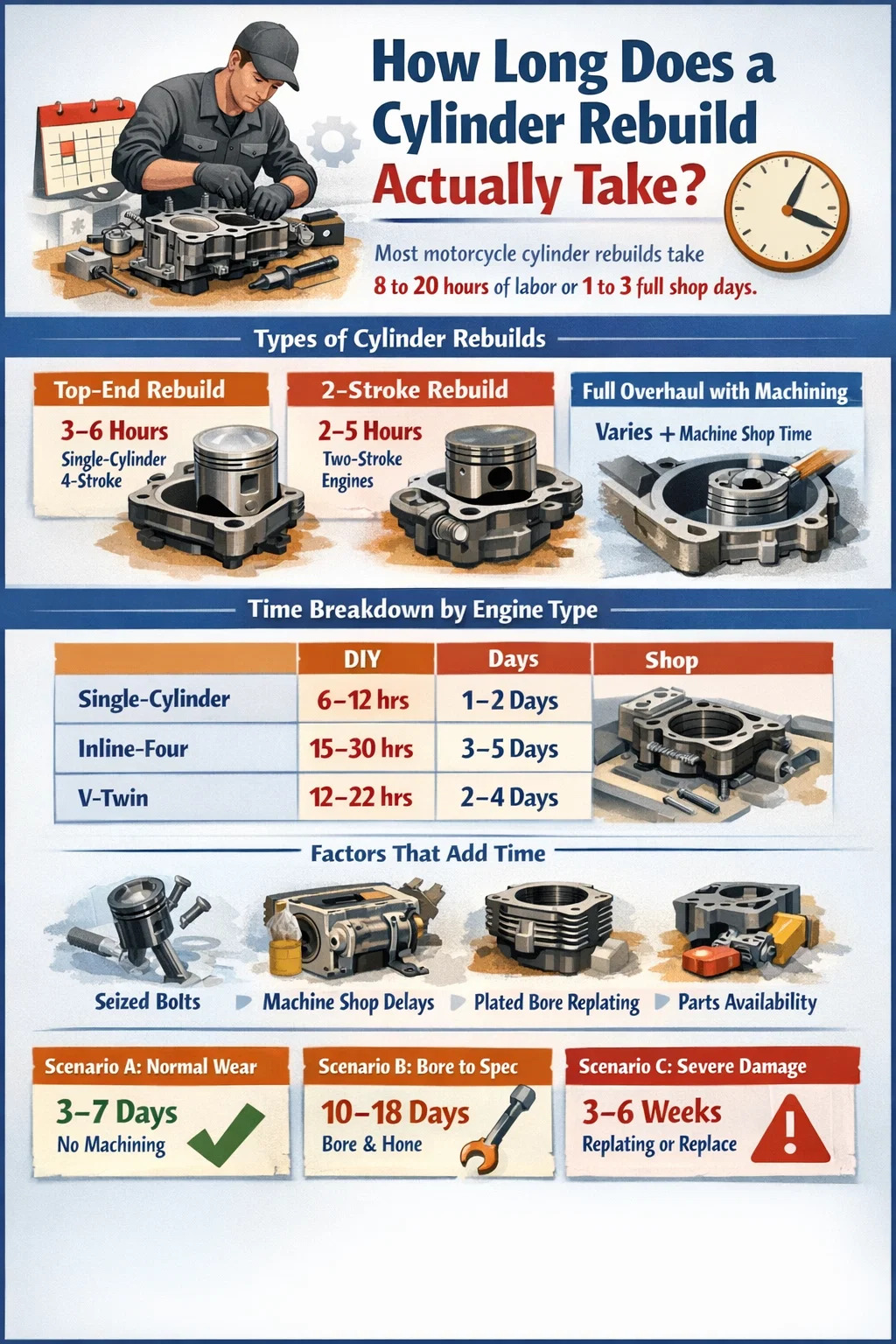 Những ước tính trừu tượng rất hữu ích nhưng những ví dụ cụ thể sẽ truyền đạt thực tế rõ ràng hơn. Đây là cách dòng thời gian thực sự diễn ra trong ba tình huống xây dựng lại xi lanh xe máy phổ biến.