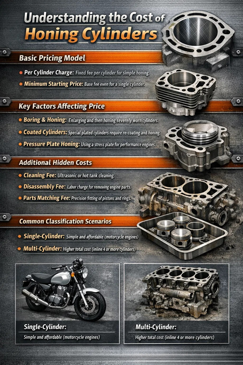 Phí tối thiểu hoặc giá khởi điểm: Ngay cả khi bạn chỉ có một xi lanh xe máy để được xử lý, nhiều cửa hàng sẽ có giá khởi điểm tối thiểu. Điều này là do việc thiết lập máy và cố định các bộ phận cũng mất nhiều thời gian.