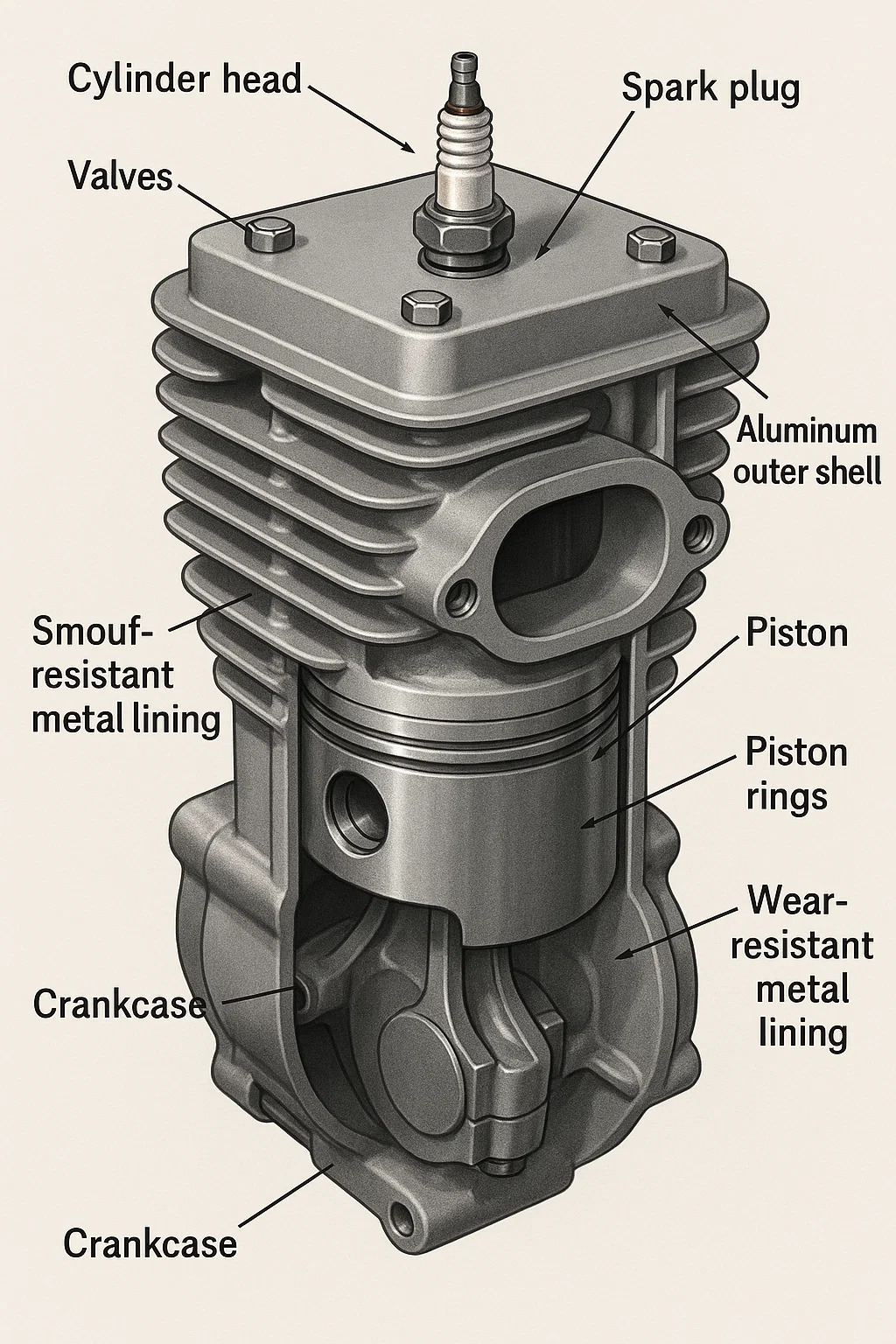 Thường có lớp vỏ ngoài bằng nhôm (tản nhiệt nhanh nhẹ), bên trong có lớp lót kim loại chống mài mòn (như lớp phủ niken-silic hoặc lớp lót sắt) để chống mài mòn cho piston.