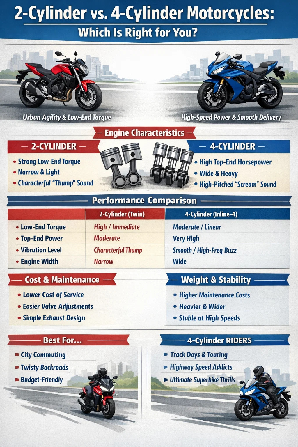 Câu hỏi xe máy 2 xi-lanh hay 4 xi-lanh "tốt hơn" không có câu trả lời chung, nhưng sự phân biệt về chức năng rất rõ ràng: Một chiếc mô tô 2 xi-lanh vượt trội hơn về mô-men xoắn ở vòng tua thấp, sự linh hoạt trong đô thị và công thái học hẹp, trong khi một chiếc mô tô 4 xi-lanh là vua không thể tranh cãi về độ ổn định ở tốc độ cao, mã lực cao nhất và khả năng truyền lực mượt mà. Nếu chuyến đi của bạn bao gồm việc đi lại trong thành phố và những khúc cua núi chật hẹp, thì hai xi-lanh thường mang lại trải nghiệm hấp dẫn hơn. Tuy nhiên, nếu bạn khao khát tiếng kêu của động cơ vòng tua cao và dành thời gian trên đường đua hoặc đường cao tốc dài thì bốn xi-lanh xứng đáng với trọng lượng và chi phí tăng thêm.